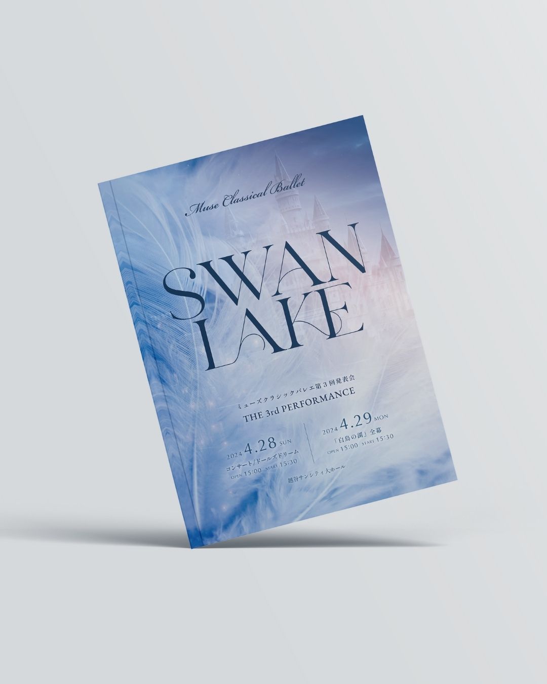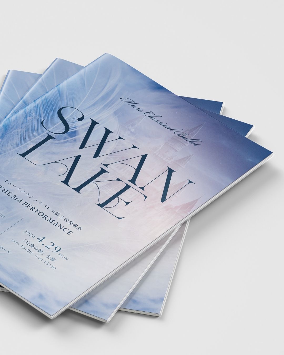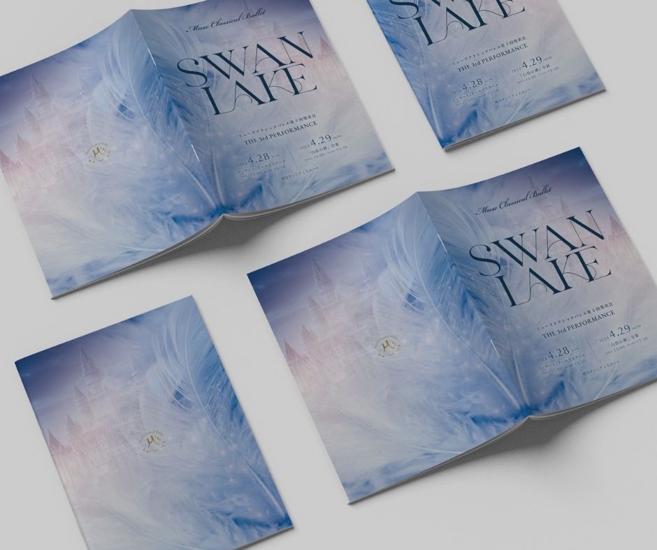 背景には背の高い塔とそばに湖のあるお城の風景。白鳥の羽を舞わせるデザインはこれまでも沢山見てきましたが、今回は2枚の大きな羽が覆いかぶさる、他にはない「白鳥の湖」にデザインさせていただきました。