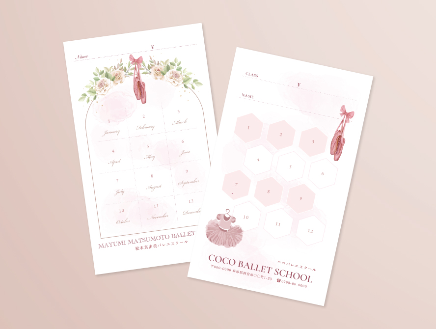 名刺やカードなどの紙ものデザイン、月謝袋・Tシャツ・カレンダー・ノートなど